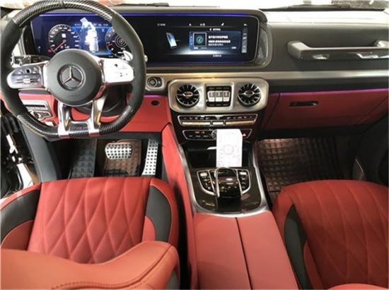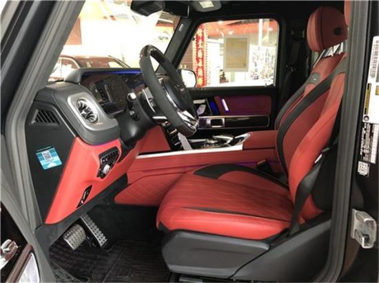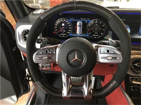 20款奔驰G63采用家族化设计风格,新样式三幅式AMG专属方向盘、仪表盘与中控屏采用连屏设计,视觉上非常有科技感。车内使用了大量的银色哑光饰条的点缀,看上去很有运动氛围,同时圆筒式的空调出风口和副驾前方的扶手,进一步展示了新车的越野风格。