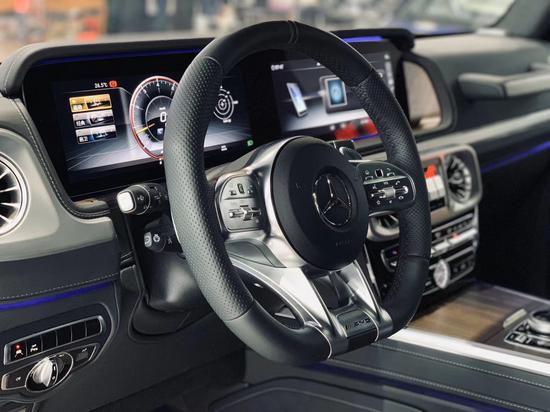 2020款奔驰G63换装了全新造型的平底式AMG运动方向盘,其两侧配以打孔皮质包裹,下部镀铬装饰的造型也与新G 500明显不同,看上去十分战斗。此外,全液晶仪表盘+中控大屏的双12.3英寸屏幕设计在新车上也没有缺席,营造出了浓郁的科技感。