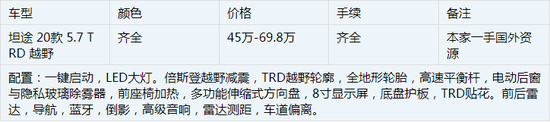 近日汽车编辑从天津港口平行进口车自贸区店内获悉:2020款丰田坦途SR5版粗犷庞大的身形完全给我留下美式风格的初步印象,而高大的车身也能完全能让那些路上时很嚣张的高档SUV产生一股莫名的紧张感,5.7升的发动机基本可以应付任何的路面,381的最大马力可以飞驰在高速公路上。