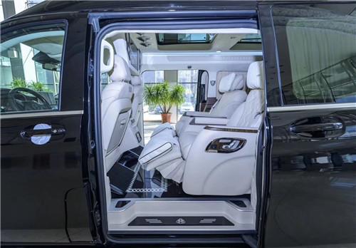 进口奔驰迈巴赫VS680商务车改装改装 每一席座椅皆享尊贵定制级的豪华舒适,即便身处第三排,亦能享受以人机工程学打造的应需而变的舒适旅程,排坐椅垫可前后电动调节,椅背整体可倾斜,实现躺卧姿势。宽大的中央扶手采用皮质包覆,提升用户便利性。