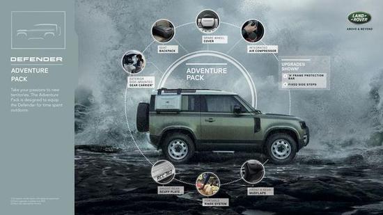 冒险包(Advanture)同样保护挡泥板、侧行李挂件、备胎罩,增加了后包围护板、便携的冲洗和内置气泵系统。冲洗系统自带水管喷头和6.5L的存储水,可用于清洗车辆、冲鞋甚至洗澡。