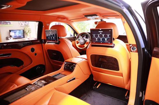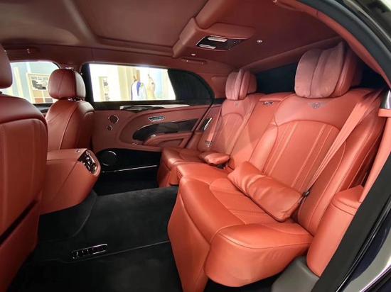 内部充分利用额外的后排空间,宾利研发了航空式电子腿托,组装在两个后排座椅的基座上。腿托可以向外延伸和旋转,为后排乘客提供直立、放松、倾斜等不同座椅位置的乘坐体验。在慕尚长轴距版的两个后排座椅之间,有一个控制台,还提供各种实用功能,例如USB接口、笔架、杯托和玻璃盖储存区。