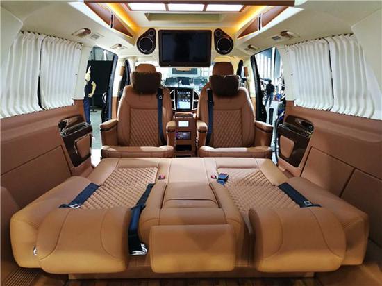 奔驰威霆七座车型的第三排沙发,支持一键放平或者收起,随时为您的长途出行打造足够宽敞舒适的卧铺,简约时尚的氛围灯与豪华柚木地板交相辉映,是对精致移动生活的皮质追求!