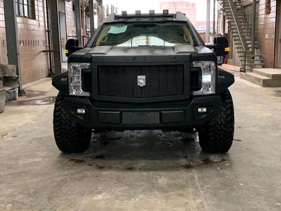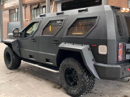 新款乔治巴顿中央镶嵌金光闪闪的乔治巴顿犀牛标志,下方为两个实用的拖车勾,有了它,外出越野的乔治巴顿偶尔救助一下被陷的同行车辆也是蛮有自豪感的,两侧的自动大灯竖状排列,每个细节都与车身棱角分明的风格相呼应,外部配置:前后金属防撞保险杠,红外线热成像,防爆套件,装甲漆,防砸复合玻璃,双Webasto spoiler天窗,电子差速器,战车外观套件(外装把手`外装脚踏孔 出入脚踏板),重载备胎架,双USSV排气管,一键启动。