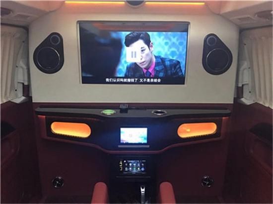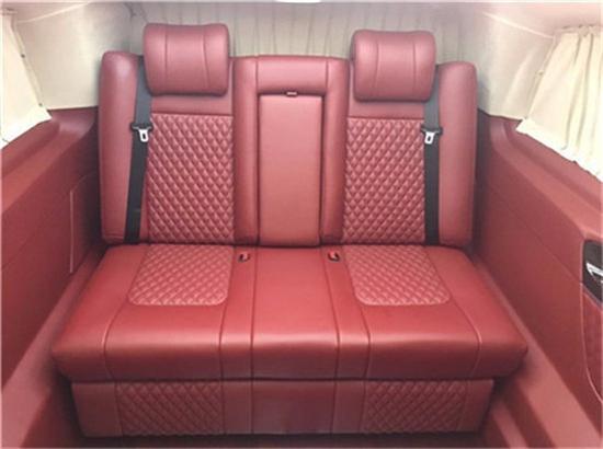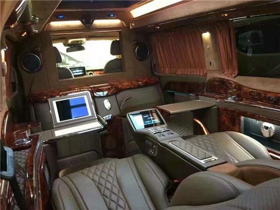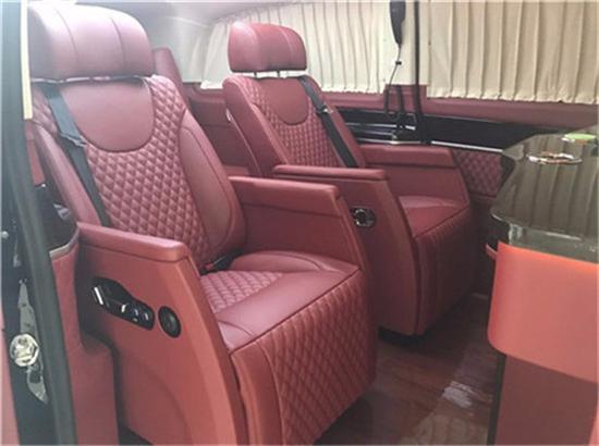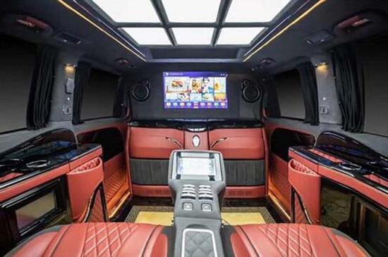 进入新款奔驰V260L改装新红钻版贵宾舱内,整车采用的前后舱隔断设计,隔断处安放有一台32寸的可升降液晶电视,在配合整车多个BOSE 5.1声道扬声器单元,您轻易可在如此宽广、凉爽的座舱内,享受极致的影音。值得一提的是,整车的吧台设计感十足,两侧的氛围灯效果出众,给人愉悦之感。吧台下方为后舱总控制屏,可控制诸如:隐藏窗帘,电视升降、整车氛围灯等电器运行。再下方除了有空调调节器之外,还设有飞利浦3D DVD机以及BOSE功放机。整车的娱乐设备十分完善。奔驰V260L改装商务车,复合地板 影藏秘书座椅 USB接口 220V电源 吧台 索尼蓝光DVD 32寸升降液晶电视 隐藏电动桌板 流线型高顶 整车运动包围 脚踏板 九宫格棚顶 梅赛德斯奔驰亮标迎宾踏板 氛围灯带 咖啡壶隐藏式 前后对讲电话等。