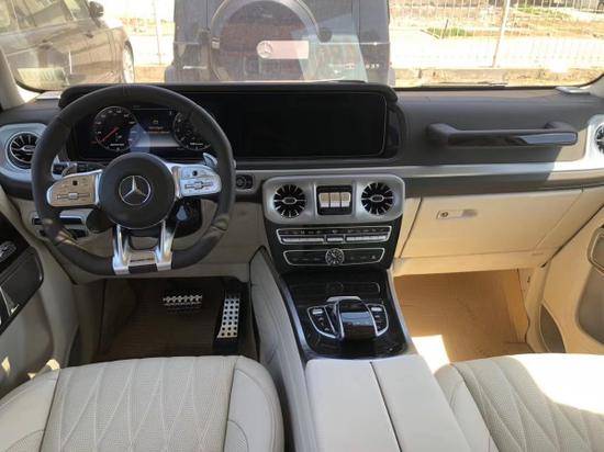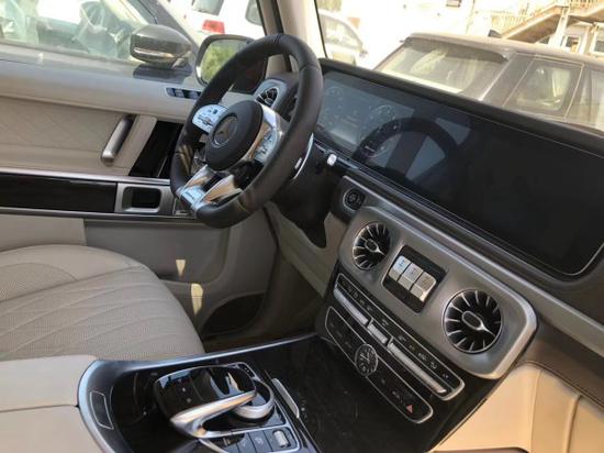 20款奔驰G63拥有了旗舰级应有的豪华感,不过经典的副驾驶席扶手和三把锁的开关键依旧延续了经典设计,并设置在中控台最显眼的位置。其中双12.3英寸高清屏,虚拟仪表盘与中控液晶屏融为一体,视觉上形成一个宽屏驾驶舱,中部的涡扇式空调出风口也颇具设计感,还大量采用了皮革的包覆。