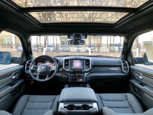 19款道奇公羊大角牛皮卡在内部设计上还是延续了美式那种比较粗犷的风格,规整的中控台设计看上去比较死板,但丰富的配置会让你不由得为其称赞。中控台的设计简洁硬派,符合公羊的气质。仪表盘底边有花纹,则更加凸显了这款车的文雅性。软性材质的仪表台设计,摸上去手感非常舒服,并无些许生硬之处。