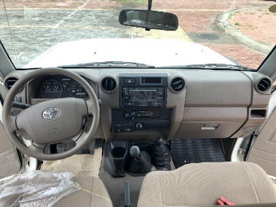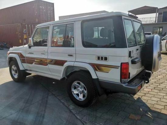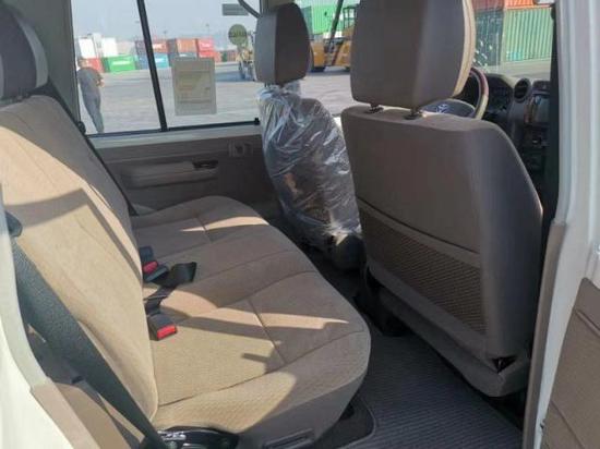 19款丰田LC76 柴油V8 4500排量 柴油D4D,ABS VSC HAC ATRC EBD EST 双气囊 空调 涉水喉 前后差速锁 绞盘 雾灯 宽体轮眉 挡泥板 踏板 电动车窗 电动门镜 电动天线 轴头锁 脚垫 彩条 外部温度显示 130升油箱 织物座椅 外观镀铬套件 音响系统 拖钩 电动天线 桃木 备胎罩 油桶。 中东版丰田LC76标配十分硬朗,所有的线条几乎都是直来直去,这赋予了它更高的可靠性和对复杂路况的强大适应能力,当然这些能力的发挥也有赖于驾驶者技术水平。虽然十年来,汽车科技可以说是日新月异,但对于一台硬派越野车来说,其实科技的作用并不大,因为分时四驱、整体桥悬挂这些经典的机械结构,才是硬派越野车最需要的东西,花里胡哨的各种高科技配置反而会成为累赘。