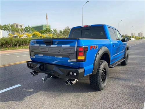 全新福特猛禽F150方方正正的前大灯与前保险杠造就了完美的车头造型与比例,进气格栅采用蜂窝状网格设计,并配以雕刻式的福特品牌标识。其前保险杠相当硬朗,且保险杠下方配备金属护板,以应对极端路况环境。整体的车架由高强度钢冲压而成,这样不但提高了车身的耐用性,更对乘客在安全方面有了进一步的保证。