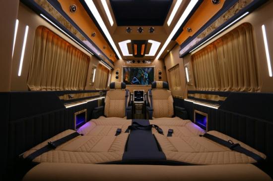后排可放平成沙发床,躺3个认识没有问题的呦。且带有前后舱全隔屏,豪华内饰装饰,高光泽条木装饰。迈巴赫车顶灯光,衬托奔驰斯宾特的独特之处。车顶前舱天窗设置,后舱车顶长方形灯光,立体感十足。LED温馨氛围灯、内饰灯、壁灯,照耀整个车舱,让您在车内不会感觉压抑感。