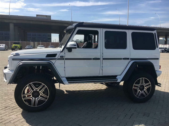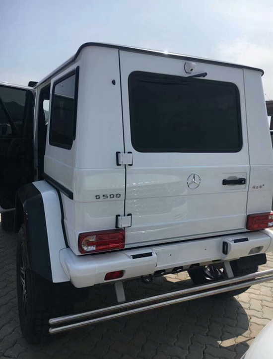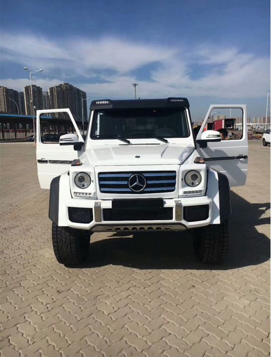 17款奔驰G500欧版4x4外观, 前保险杠采用与G级AMG车型采用了相同的设计,保险杠下部增加了镀铬下护板,车顶增加了可拆卸的碳纤维扰流板,扰流板两侧融入了LED灯光系统。新车轮距进行加宽,17款奔驰G500 4x4与普通版G500相比采用越野地形底盘 四轮独立悬挂,具有最高通过性的纯种地形越野车,17款奔驰G500 4x4四轮独立悬挂越野车的四轮轮眉宽度有了明显的增加,黑色的碳纤维轮眉赋予了整车更为强悍的通过能力和越野能力的野性。