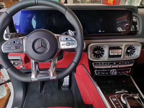 全新奔驰G63的AMG方向盘手感极佳,驾驶辅助和仪表信息通过左侧按键控制,如自适应巡航设定跟车距离4级调整。右侧选择键同样为触控键,可直接控制中控屏和多媒体的内容,下方的按键可控制音量和蓝牙电话,转向灯和前后雨刷功能都集成在了左侧拨杆上,换装9G-TRONIC变速箱后,在换挡速度、平顺性上都有了一定提升,更多的挡位也有助于提升燃油经济性。