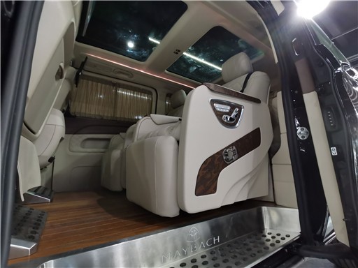 相比外观来说,内饰的升级才是此车亮点,中央扶手箱处被一台车载冰箱所取代。座椅及仪表台上方全部采用双色nappa真皮的包,一体式弧面中控饰板也做了全新的换装。前后舱隔断设计,私密性好,老板们用来洽谈接待也很合适。整车地板选用实木材质,中排座椅改为了两张独立的航空头等舱座椅,支持360度旋转,集按摩、通风、加热、电动腿托等功能。