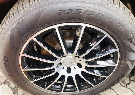全新奔驰G550多了一份运动感,像轮毂外圈都做了红色线条喷绘,刹车卡钳也是红色,包围也是全黑化。新款G级在车身尺寸上变化不大,规格为4864*1984*1974,轴距2890,整备质量2610公斤,5门5座设计。侧面线条非常平直,看起来很硬朗,车窗也是方方正正,后面两排窗户都是隐私玻璃。G550的离地间隙还是有点高,所以上车踏板是必须配置的,轮眉跟车轮的间隙也比较大,突出了原始野性。这台样轮胎配置很高,达到295/40 R22,备胎是全尺寸的,位于车尾外挂。