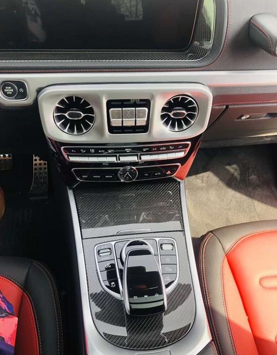 20款奔驰g550大量的碳纤维应用让整车内饰看起来时尚很多,标志性的硬性三把差速锁必须标配,独特的飞机螺旋式的出风口高档感不言而喻。