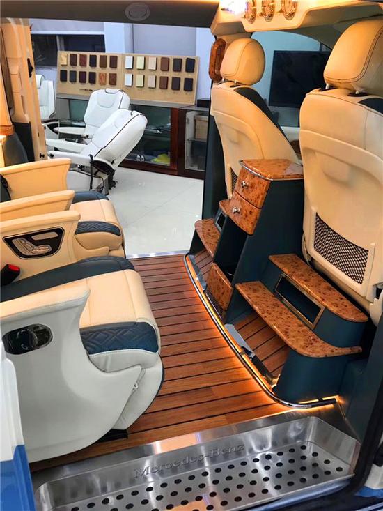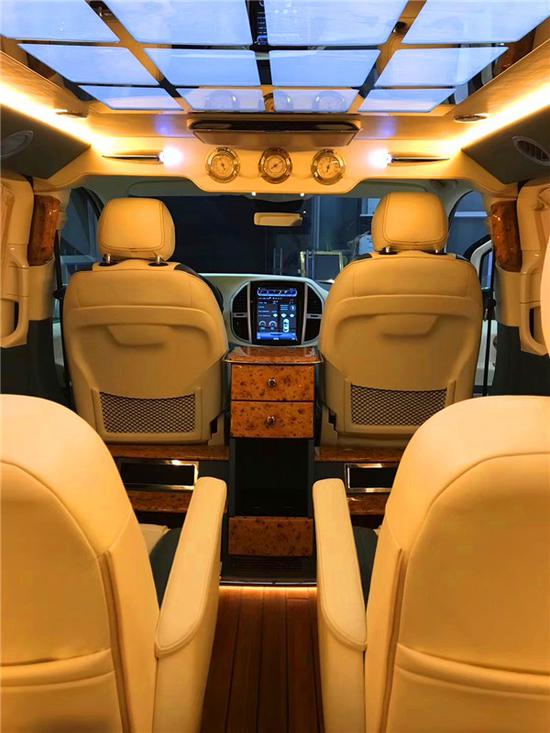 精练威霆改装整车加装了登车踏板、全车镀铬套件、LED迎宾踏板、LED灯饰及油漆同色,使整车更加尊贵霸气。竹苞松茂的时尚窗帘,8偏向电动调治按摩航空座椅,座椅阁下的文娱节制中隔屏,车内电器可任意一键操纵,可开启式全景天窗,在浩大的夜景中,共同“满天星”格调,好像在豪华的宫殿。