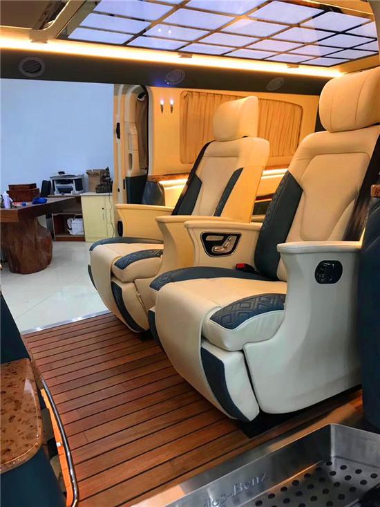 进入奔驰威霆 (配置|询价)7座改装后舱,立刻就会被它的豪华绚丽而征服,整车环保真皮包裹,游艇级柚木地板铺设,豪华感无处不在。全部采用真皮制作,豪华木饰装点,带有按摩加热通风功能。后舱前为两个独立航空座椅,第二排座椅安装进口首席航空座椅,加热通风按摩功能齐全,最大限度的减缓您的乘车疲惫。八向电动调节:电动头枕,电动腿托,前后电动调节,电动靠背调节。第三排为一组沙发座椅(可电动展平,形成一张舒适的沙发床)。