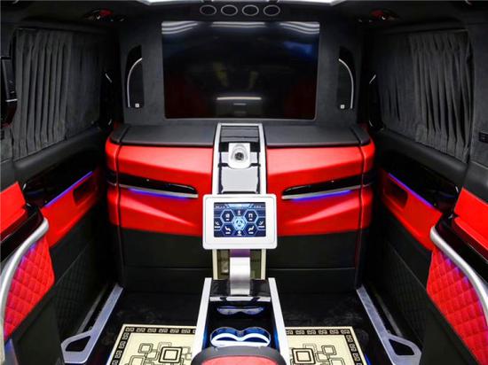 奔驰定制版V260L改装厂内饰内采暖色调处理,在营造居家氛围的同时也提升了不少档次,悬浮式后置中控台的设计,将排档和高智能行车电脑巧妙融入,配合人性化的按键设计:中控台上路设置了前排空调控制及部分车辆功能按键区域划分明确,操作起来很顺手。