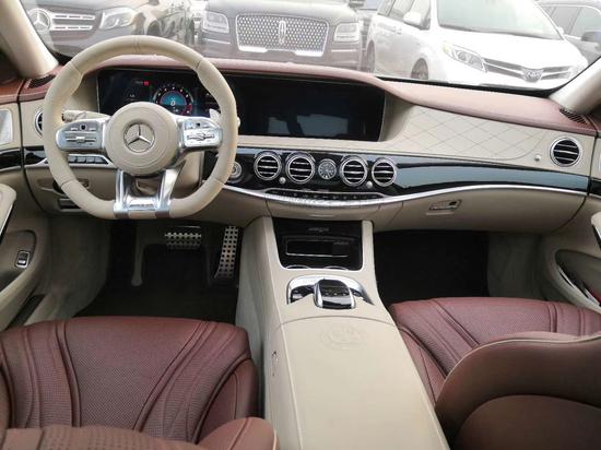 采用了奔驰全新设计风格,其内饰面板和车顶均由真皮包裹,搭配真皮座椅,彰显华贵气质。中控台配备有两块大尺寸液晶中控显示屏,出风口中央配有IWC万国时钟,凸显整车豪华感。全新三幅式多功能方向盘采用黑色翻毛真皮包裹,并用银色镀铬进行点缀,战斗感、科技感、豪华感无缝融合。
