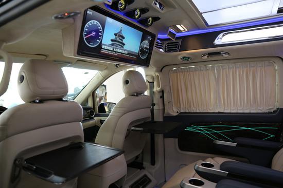 进口奔驰V250 商务车改装电动天窗可为乘客提供明亮、温馨的车内环境。天窗可电动开启,让人在旅途中更加亲近自然。遮阳帘可抵御强光的照射。在加配迈巴赫9宫格棚灯,让您欲罢不能。