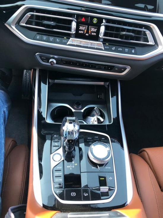 20款宝马X7内饰部分,宝马X7采用最新家族式设计语言,使用大量真皮、木纹饰板进行包裹。配备12.3英寸带有注意力检测的全液晶仪表和12.3英寸悬浮式触控显示屏。空调出风口与温度显示屏、实体功能按键结合在同一区域,并使用银色装饰条进行点缀。下方盖板下方为带有加热、制冷功能的杯架,全新的水晶电子挡杆造型十分精致,进一步提升了车内的豪华氛围。