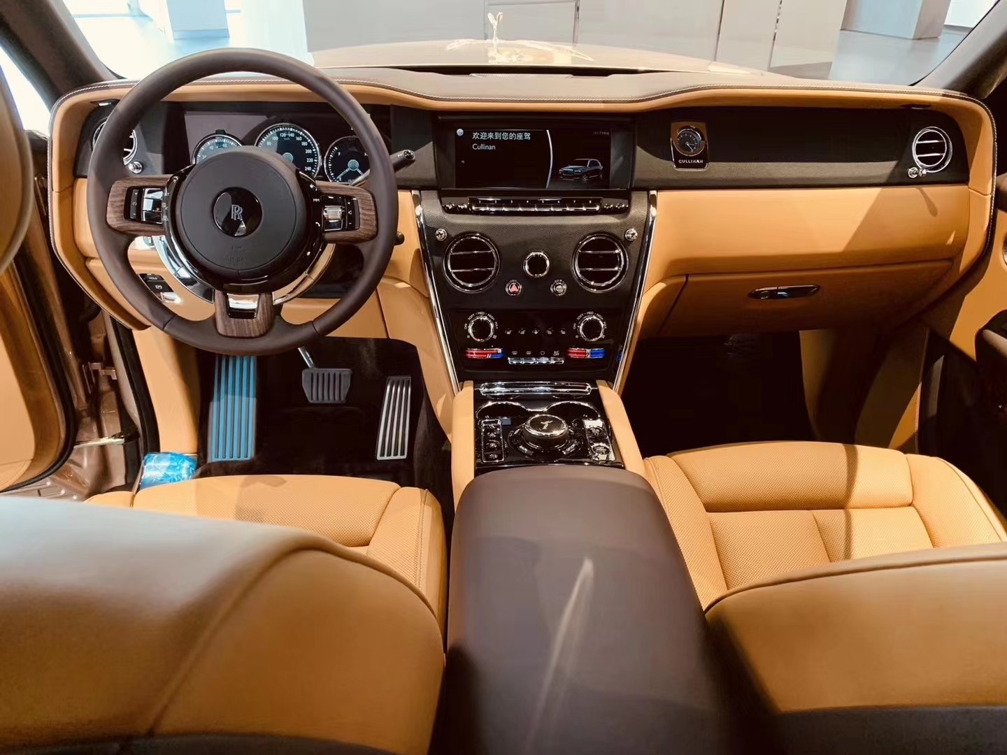 库里南采用整齐的风格,很有英国皇室的设计感觉,不仅奢华还相当大气,也不会让人觉得过度炫耀。整体内饰都运用高档的真皮覆盖,采用大量直的线条极为威严,中控面板的边框由手工打磨的金属条包裹,不仅将上部的仪表板和中部的控制台连接起来,更通过容纳仪表板上的横向设计元素,增加了掌控感。在舒适度和档次上都十分出色,在副驾驶座前还镶嵌一块石英表,彰显了属于劳斯莱斯特有的贵族气质。