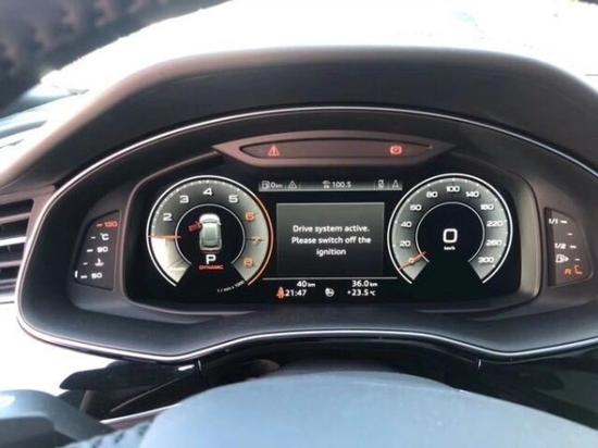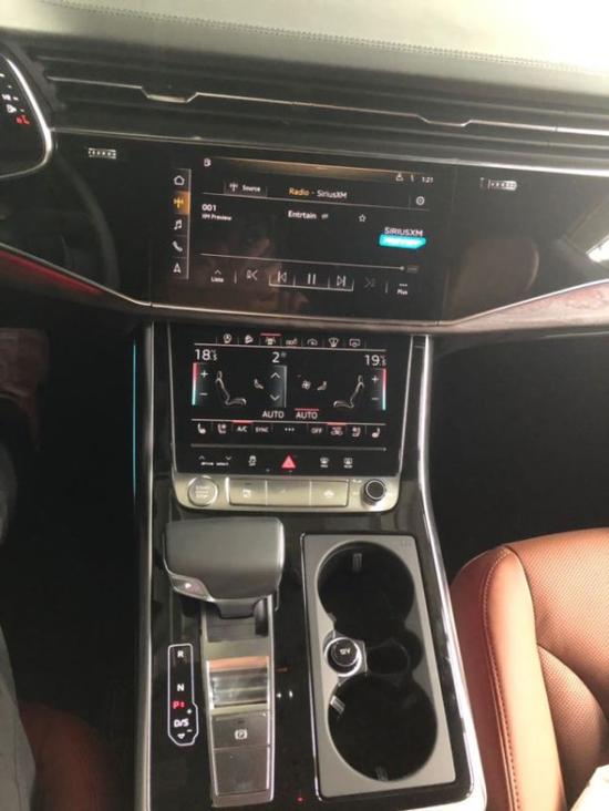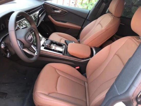 车厢内部,会感觉奥迪Q8和全新A8的设计高度雷同。奥迪全新家族化设计,科技感十足的虚拟驾驶舱氛围,同样的三块大屏,横向贯穿的前排空调出风口。中控台采用大面积的真皮包覆,且向驾驶员一侧倾斜,形成以驾驶员为中心的驾驶舱。整个中控采用了全触屏来对车辆进行操控,没有一个实体按键,对技术要求极高,非常的高大上。