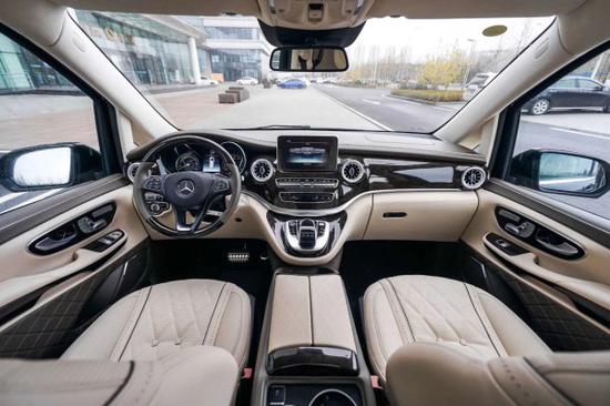 奔驰V (配置|询价)260L商务车中控台叶子纹转印,8.4寸高分辨率TFT彩色屏幕,操控台包覆。奔驰V260L七座商务车驾驶舱真皮座椅,正副驾驶中间车载冰箱,中控台由岑木木饰和高级仪表台专用真皮软包及装饰,控制系统方面,采用新一代COMAND驾驶室管理及数据系统、悬浮式显示屏、空调循环模式自动切换功能、智能驾驶系统、自动泊车辅助和360°全景影像系统、预防性安全系统PRE-SAFE等。