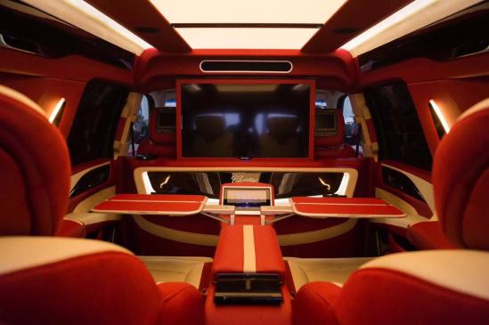 凯迪拉克总统一号驾驶室跟乘客区采用隔离设计,隔屏上有一块升降高清电视。下面吧台设计功能强大,集成影响,DVD,电动反向座椅及电动小桌板。