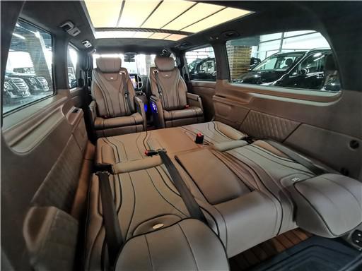 相比外观来说,内饰的升级才是此车亮点,中央扶手箱处被一台车载冰箱所取代。座椅及仪表台上方全部采用双色nappa真皮的包,一体式弧面中控饰板也做了全新的换装。前后舱隔断设计,私密性好,老板们用来洽谈接待也很合适。整车地板选用实木材质,中排座椅改为了两张独立的航空头等舱座椅,支持360度旋转,集按摩、通风、加热、电动腿托等功能。
