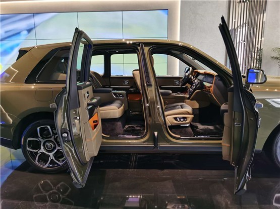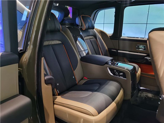 定制配置如下;前排乘客手套箱部位-鸟巢图案*头枕刺绣鸟巢图案*扬声器及时钟表面-深色PVD物理气相沉积*内饰真皮细节-深橄榄绿Dark Olive/ 双色揽景座椅*揽景座椅-座椅部位黑色Black*22寸部分抛光BB轮毂*暗黑欢庆女神*BB科技碳纤维*发光迎宾踏板*车门电动外侧关闭*对比缝线-橘色*RR头枕刺绣-橘色*前排按摩座椅*羊羔毛脚垫*全景天窗*餐桌*门板欢庆女神浮雕*全客户定制皮革*单长腰线-橘色*外部不锈钢套件*后排中央固定2座独立座椅[包含配置;后排座椅按摩*后备箱隔屏玻璃*电动可调节座椅*香槟冰箱含俩香槟杯*威士忌酒柜含两个威士忌杯*香槟及威士忌杯托*无线充电基座*12V电源X2*无线充电]*前排座椅通风*车顶延长皮革*科技CC定制时钟*劳斯莱斯定制音响*后排娱乐系统*内部抛光套件*定制钥匙-黑色。