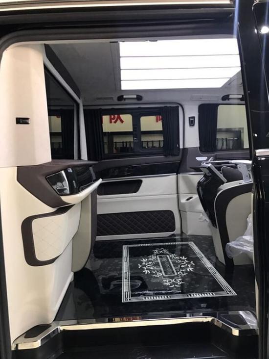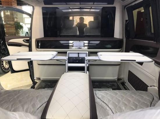 奔驰V250房车贵宾舱则用采用豪华皮革、麂皮绒包覆,前后舱采用电视+吧台的实用隔断,丹麦丹拿5.1殿堂级音响环绕系统+32寸高清升降电视+索尼蓝光DVD的经典车娱组合,给您舒适与娱乐相结合的享受。全隔断的吧台设计十分简约,珍贵的雀眼枫木木板与真皮互相搭配,看似简单,但却是不一般,只要一键开启,双侧的隐藏秘书座椅就会缓缓推出,这就是这款V250设计巧妙之处了。乍眼一看贵宾舱仅有两座,但其实还隐藏有两个座椅在其中。