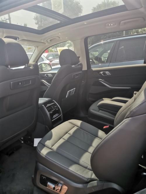 20款宝马X7来到第排,X7配备三段式星空全景天窗,前排座椅背部提供两块娱乐系统显示屏,后排独立空调下方还集成了储物格、双USBType-C充电接口、12V电源以及娱乐设备,同时B柱也配有空调出风口。六座版车型第排为两个独立座椅且带有电动调节功能(7座车型第排还支持前后14.5cm的滑动调节),上方配备两个头枕,内侧配有座椅扶手,大幅提升了乘坐舒适性。