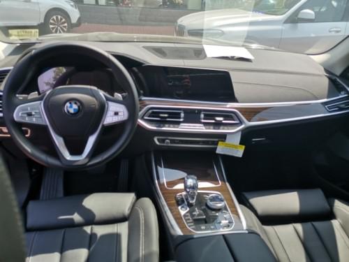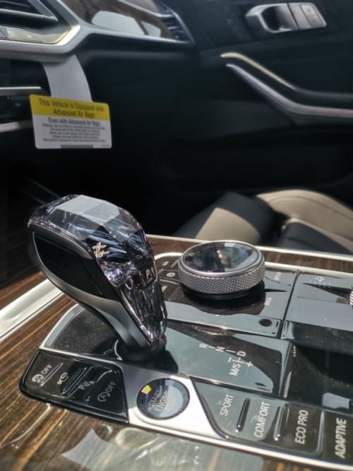 20款宝马X7内饰部分,宝马X7采用最新家族式设计语言,使用大量真皮、木纹饰板进行包裹。配备12.3英寸带有注意力检测的全液晶仪表和12.3英寸悬浮式触控显示屏。空调出风口与温度显示屏、实体功能按键结合在同一区域,并使用银色装饰条进行点缀。下方盖板下方为带有加热、制冷功能的杯架,全新的水晶电子挡杆造型十分精致,进一步提升了车内的豪华氛围。