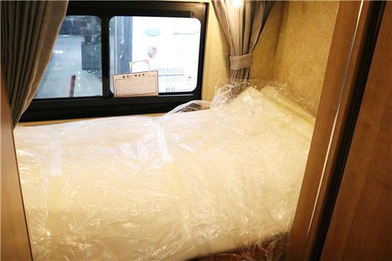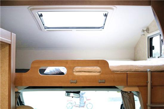 驾驶室顶部是一个额头床,得益于览众大额头的设计,这里的空间表现相当出色,床板掀起以后,底部是一台互联网电视。