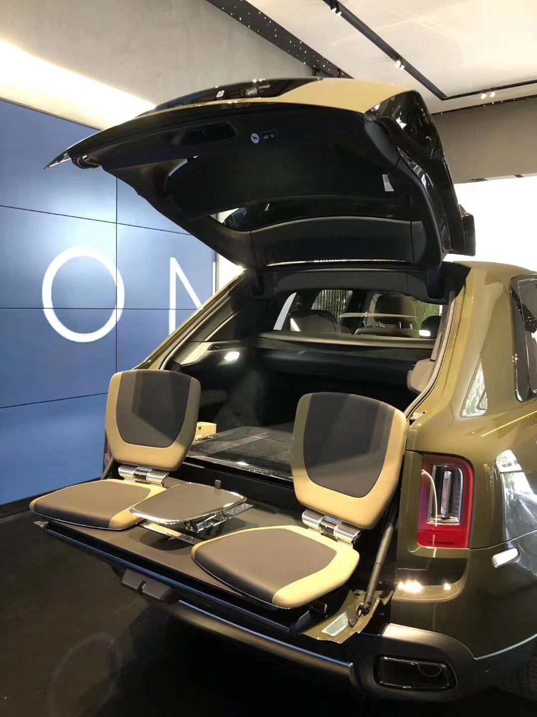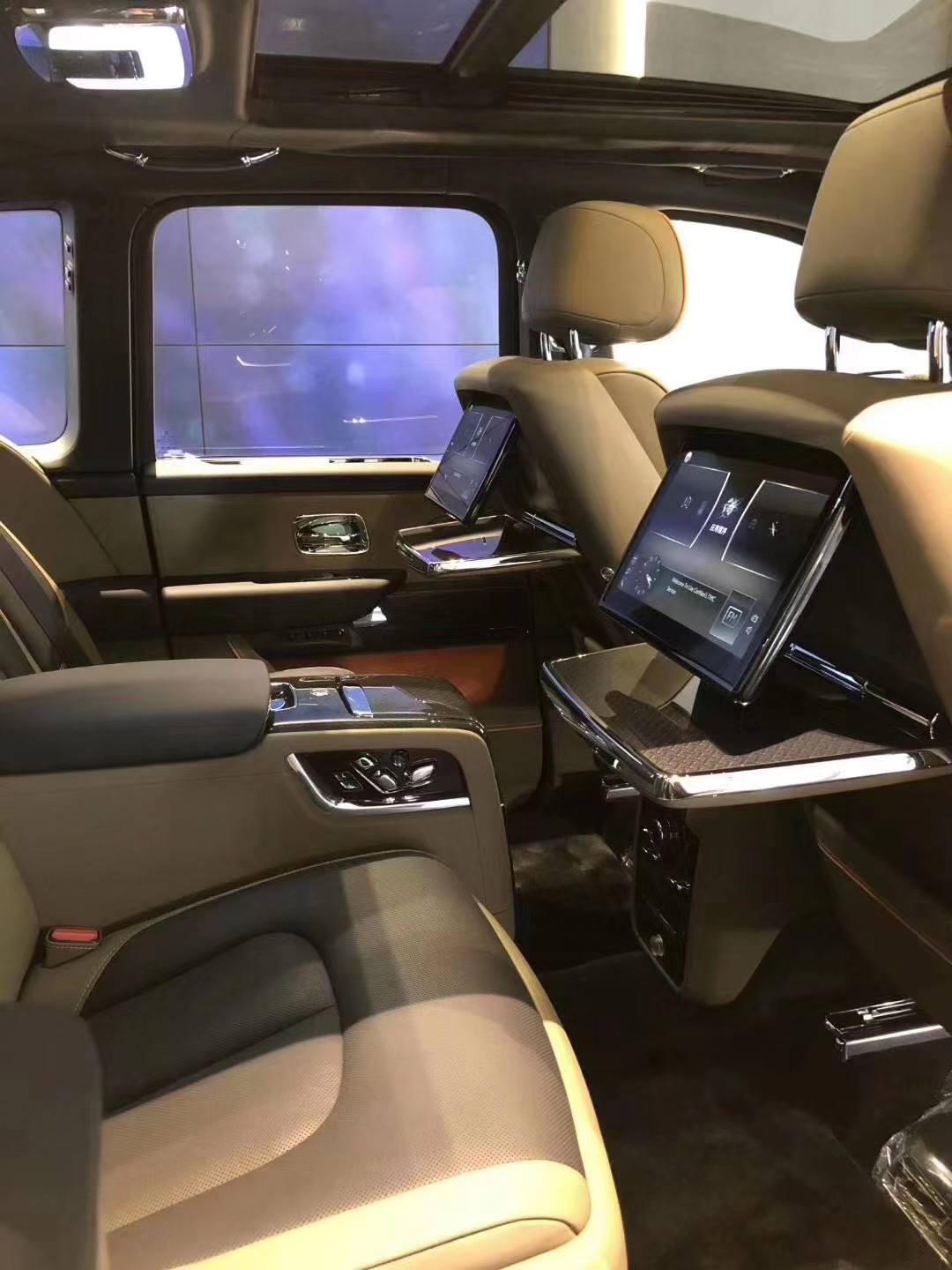 车身侧面从B柱开始,车顶线条就十分流畅,至后风挡时线条走速更快并迅速下落,让行李厢盖都显示出优雅的样子,这一侧面设计是向上世纪三十年代劳斯莱斯汽车设计致敬。据悉新车的整体尺寸为长宽高5341×2164×1836mm,轴距3295mm,整体远大于宾利添越 (配置|询价)与路虎揽胜 (配置|询价)长轴距版。经典的马车式对开门彰显奢华的仪式感,开门时车身会自动下降40mm,方便乘客上下车,启动后车身则会自动升高。