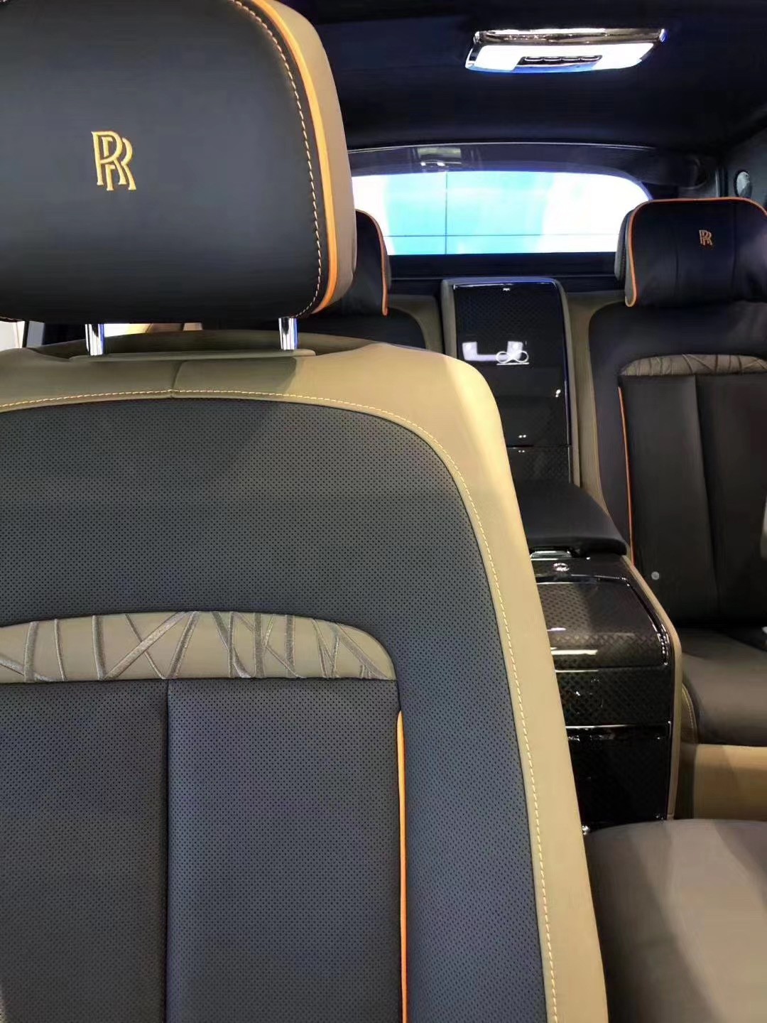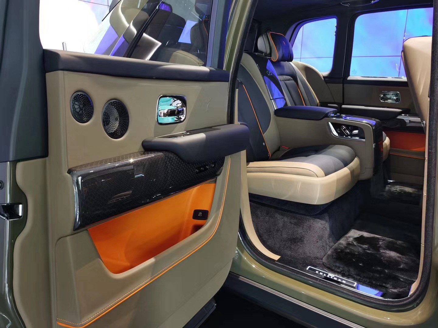 定制配置如下;前排乘客手套箱部位-鸟巢图案*头枕刺绣鸟巢图案*扬声器及时钟表面-深色PVD物理气相沉积*内饰真皮细节-深橄榄绿Dark Olive/ 双色揽景座椅*揽景座椅-座椅部位黑色Black*22寸部分抛光BB轮毂*暗黑欢庆女神*BB科技碳纤维*发光迎宾踏板*车门电动外侧关闭*对比缝线-橘色*RR头枕刺绣-橘色*前排按摩座椅*羊羔毛脚垫*全景天窗*餐桌*门板欢庆女神浮雕*全客户定制皮革*单长腰线-橘色*外部不锈钢套件*后排中央固定2座独立座椅[包含配置;后排座椅按摩*后备箱隔屏玻璃*电动可调节座椅*香槟冰箱含俩香槟杯*威士忌酒柜含两个威士忌杯*香槟及威士忌杯托*无线充电基座*12V电源X2*无线充电]*前排座椅通风*车顶延长皮革*科技CC定制时钟*劳斯莱斯定制音响*后排娱乐系统*内部抛光套件*定制钥匙-黑色。