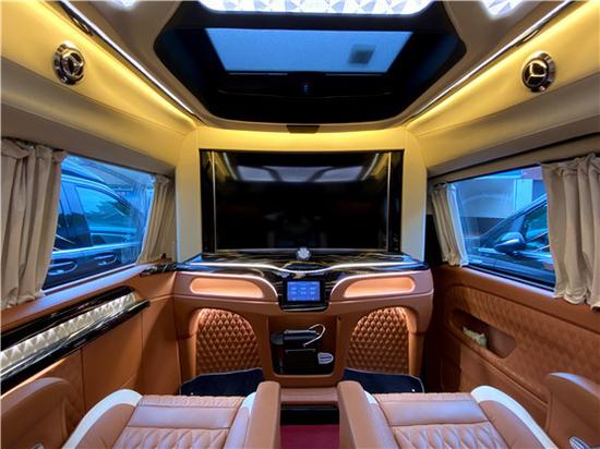 更罕见的是,这款奔驰威霆采用了全隔断的空间布局,将车内空间更加的合理利用,超大尺寸的曲面液晶电视,和车载小吧台将车内的豪华感体现的淋漓尽致。