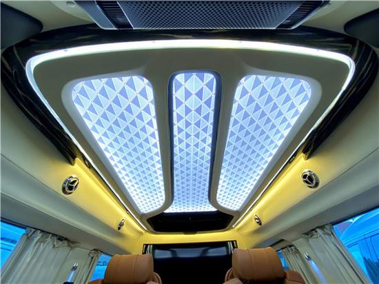 车顶部,奔驰威霆也没有放过,直接安装了LED光源的车顶大灯再搭配上两侧的氛围灯,这车内的灯光氛围真的是没谁了。