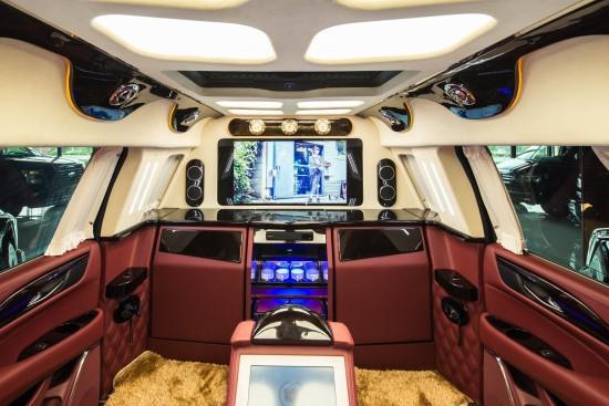 凯迪拉克总统一号整个后舱为四座规划,两个主座为至尊奢华真皮头等舱座椅款式,且带腿部支撑和电动按摩加热功用,四座椅头枕处均印有凯迪拉克标识。主座椅中央扶手处还设有控制台,让您置身舒适的座椅不必动身就可操控车内设备,相当人性化。高档奢华的异域吧台,带来梦一般的境地。