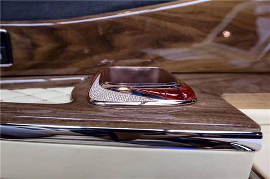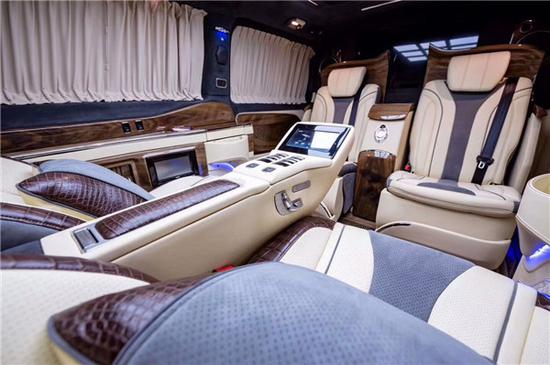 车载触控屏中控系统● 车内电器无线控制系统● 德国原装指纹识别保险柜● 车载智能空气净化器● 隐藏式一键式电控折叠咖啡机内饰商务配置● 豪华电动一键式展开记忆功能调节反向座椅(加热功能)● 高档电动调节对开天鹅绒窗帘● 豪华电动伸缩隐藏航空小桌板● 电动中滑门● 顶棚时光梯灯光● 单片式电动天窗● 进口游艇级豪华电子钟表● 全车豪华柚木与乌木装饰● 全车柚木与乌木铝质地板● 意大利进口Alcantaran麂皮绒顶● 电动隐藏式极具现代感奢华酒柜● 后排奢华三组模式一键式记忆电动折叠航空首长席(加热,通风,气动按摩)