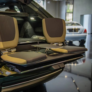 后排剧院式航空座比前排更高,对腿部支撑也更到位。前排座椅靠背上的触摸屏满足多媒体需求的同时还可以查看定位,后车门上也有配备USB接口,可以为移动设备充电。两个独立后排座椅被一个宽大的中央扶手分隔,沙发一般的座椅将提供极致的乘坐舒适性。后排座椅角度可以任意调节,为后排乘客带来旅途中的终极享受。