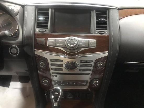 19款英菲尼迪QX80车内采用电子冷发光仪表盘,匹配8英寸高分辨率彩色触摸屏幕;方向盘带巡航、音响以及电话按键,并可实现加热功能;还带有内存为40GB的硬盘导航系统,以及9.3G的音乐存储空间。在通信系统上,配备互动式车载信息通信系统以及实时道路交通信息系统,为驾驶者用车时提供实时的道路信息。