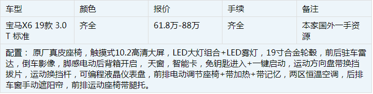 20款宝马X6以全面的性能优势征服了每一个驾驶它的人,可谓是宝马旗下的武将一枚。宝马X6搭载3.0T发动机的最大输出功率为225千瓦/306马力。在5800到6250转每分的转速区间可以稳定保持这一优异的功率值,在1300–5000转每分转速范围可提供400牛顿米的最大扭矩。