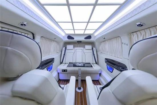 这台奔驰威霆改装房车的车舱原木地板采用了豪华拼花设计,车身内壁采用进口麂皮绒和珍贵实木装饰面板包覆,豪华宫格顶灯带来奢华氛围;前后车舱采用了半灵活的多功能中隔断设计,固定的吧台加可升降的大尺寸电视,殿堂BOSE音响和蓝光DVD,满足一切娱乐生活需求。还有多功能的现代吧台,万国钟表、液晶触控显示屏、铝制踏板和储物箱等,方便乘员房车生活使用。