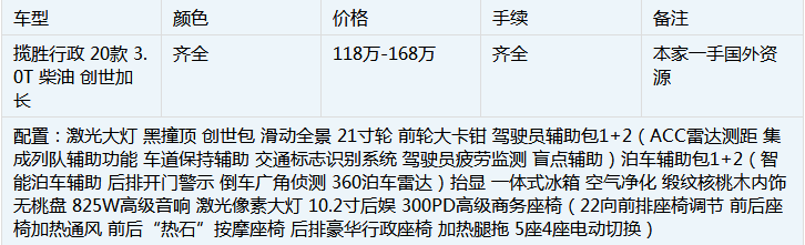 2020款路虎揽胜 (配置|询价)行政3.0柴油创世加长版兼具豪华气派与运动风格,运用镀铬装饰的线条使前脸更具科技感,车身轮廓更显雕塑感。前保险杠虽然没有现款车型的饱满但是层次感却变得非常强烈。不同角度观看头灯, 你会发现头灯的演绎是不同的,正面看依旧基本保持了矩形,但从侧面看,它又不像老款那样呆板,新的LED前大灯、两辐式格栅和更大的进气格栅,刻画出棱角分明的新前部形象,更增强车辆的运动型气质。详情如下表: