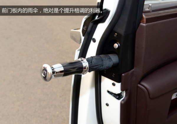 整个内饰由2000名工人,经过60双手,花费至少20天打造。其奢华程度可想而知,即便是宾利最顶级的车型慕尚,也没有盖过古思特 (配置|询价)II的锋芒。门板处藏有一把采用特氟纶涂层,简单地说就是不易存水,你别小看这把雨伞,价值6万元RMB。