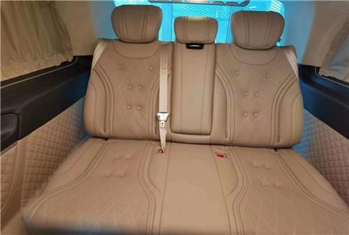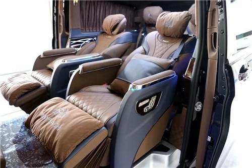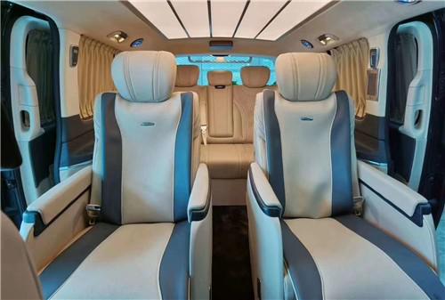 进口奔驰改装迈巴赫版VS980的迈巴赫顶灯的设计采用了来自迈巴赫62S光纤顶灯的设计,在迈巴赫光纤顶灯的照耀下,不仅仅能够保证车内的照明需求,可选配七彩变色灯,带来视觉冲击感,内饰也显得贵气十足。后排座椅柔软舒适、支撑感充足,坐姿可调幅度非常大,能够让乘客半躺姿势乘坐在后排,腿托再次加分,对比同级别车型,这个后排必须满分。
