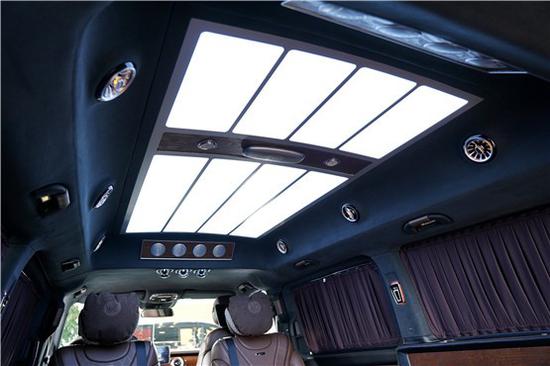 奔驰Vclass改装房车麂皮绒包覆的顶棚,加装迈巴赫宫格式顶灯和星空氛围灯带搭配,使整个内饰明亮耀人,同时略带俏皮气氛。乘坐更具温馨,浪漫,舒适感受。奔驰Vclass改装房车高雅的格调,使得内饰环境变得优美舒适!让人身心愉悦。