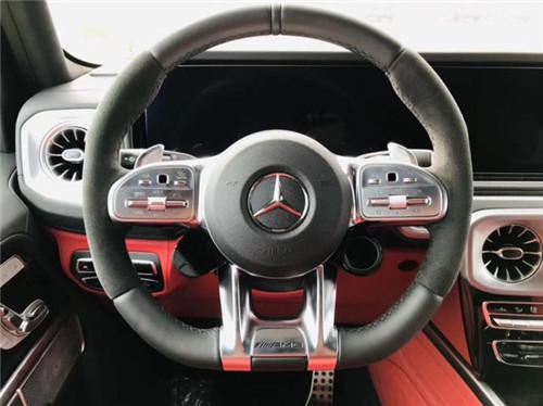 20款全新G63内饰方面,新G63保留了新G500的整体设计,除配色差异外,新车还换装了全新造型的平底式AMG运动方向盘,其两侧配以打孔皮质包裹,下部镀铬装饰的造型也与新G 500明显不同,看上去十分战斗。此外,全液晶仪表盘+中控大屏的双12.3英寸屏幕设计在新车上也没有缺席,营造出了浓郁的科技感。